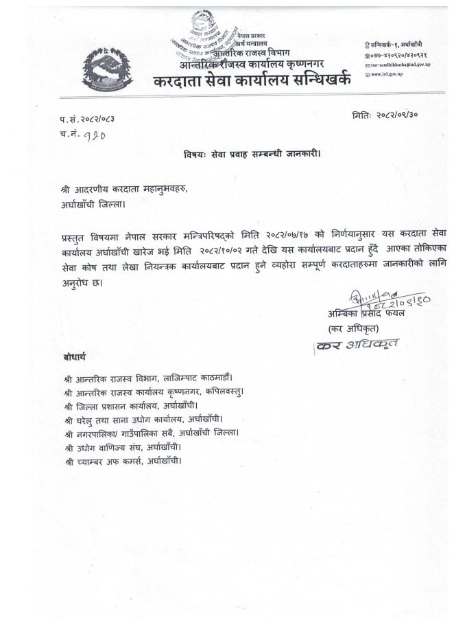 » करदाता सेवा कार्यालय सन्धिखर्कको सेवा प्रवाह सम्बन्धी जानकारी ।।।
