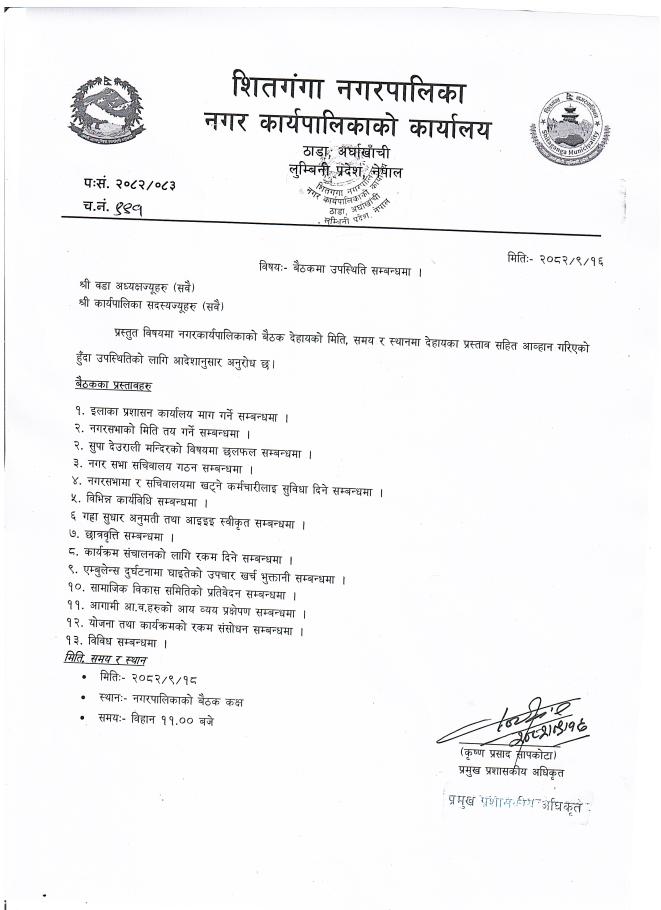 नगर कार्यपालिका वैठकमा उपस्थित सम्बन्धमा - २०८२/०९/१८ गते शुक्रबार ।।।