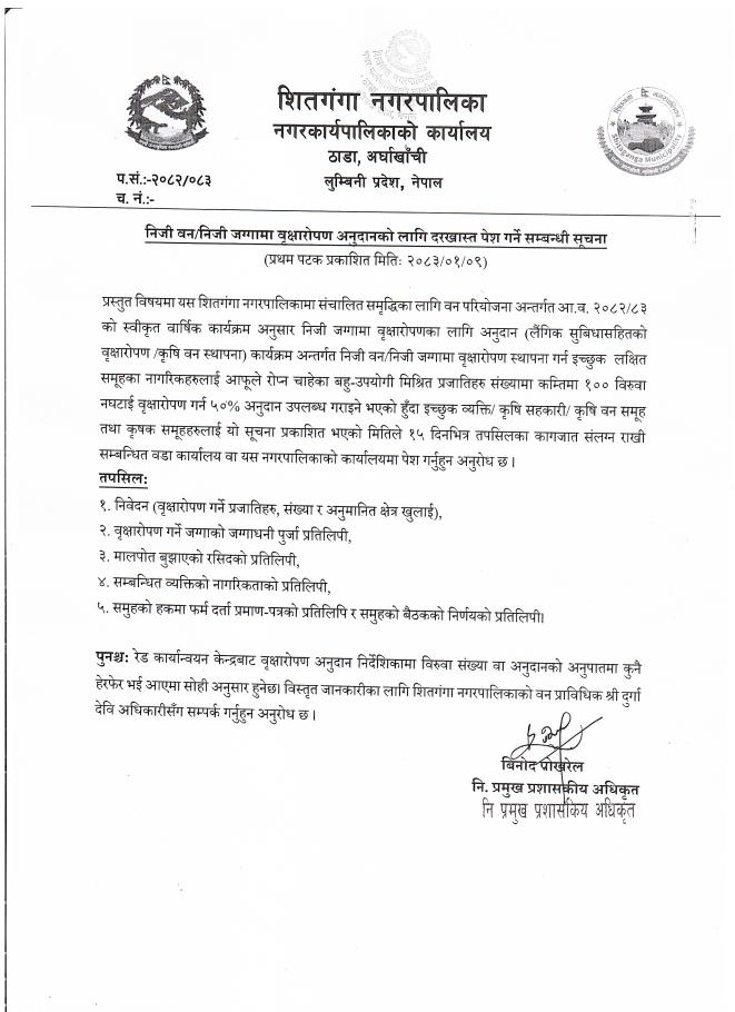 » निजी वन/निजी जग्गामा वृक्षारोपण अनुदानको लागि दरखास्त पेश गर्ने सम्बन्धी सूचना ।।।