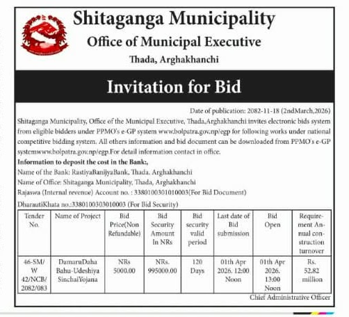 Invitation for Bid - Date of publication: 2082/12/22 on Gorkhapatra