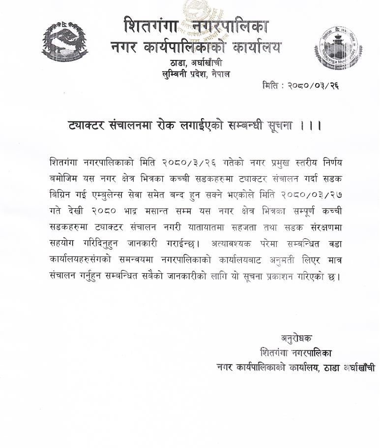 » ट्याक्टर संचालनमा रोक लगाईएको सम्बन्धी सूचना ।।।