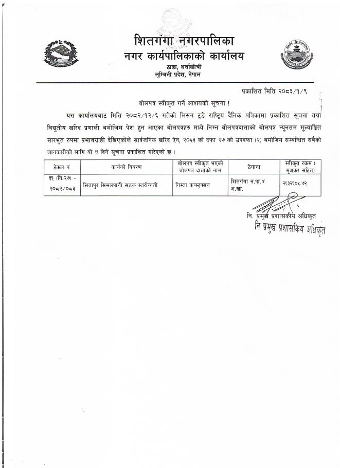 बोलपत्र स्वीकृत गर्ने आशयको सूचना - लाहापे सिलिङ्गखोला चिदिचौर सडक स्तरोन्नती कार्य ।।।