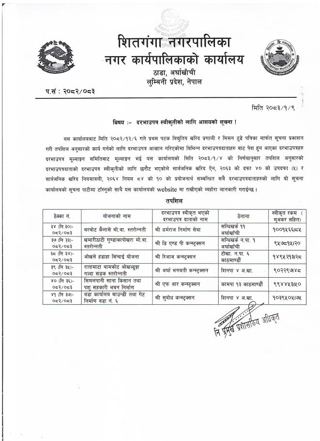 बोलपत्र स्वीकृत गर्ने आशयको सूचना - लाहापे सिलिङ्गखोला चिदिचौर सडक स्तरोन्नती कार्य ।।।