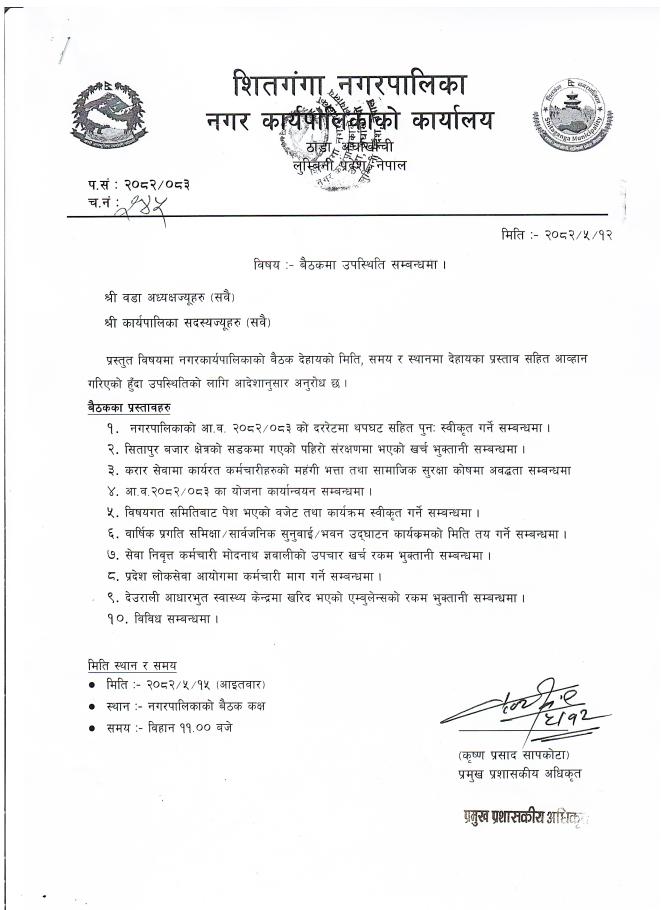 नगर कार्यपालिका वैठकमा उपस्थिति हुने सम्बन्धमा - मिति २०८२/०५/१५ गते आईतबार ।।।