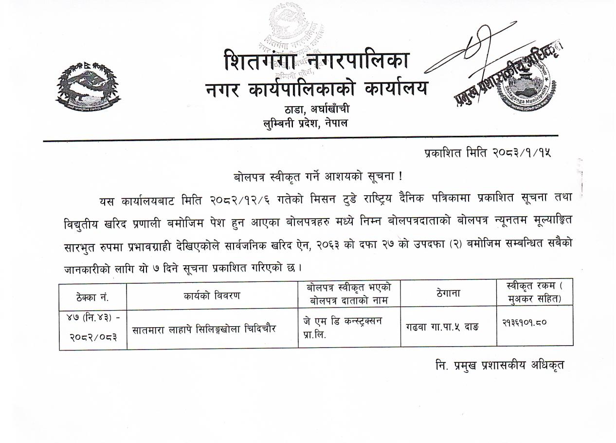 बोलपत्र स्वीकृत गर्ने आशयको सूचना - लाहापे सिलिङ्गखोला चिदिचौर ।।।