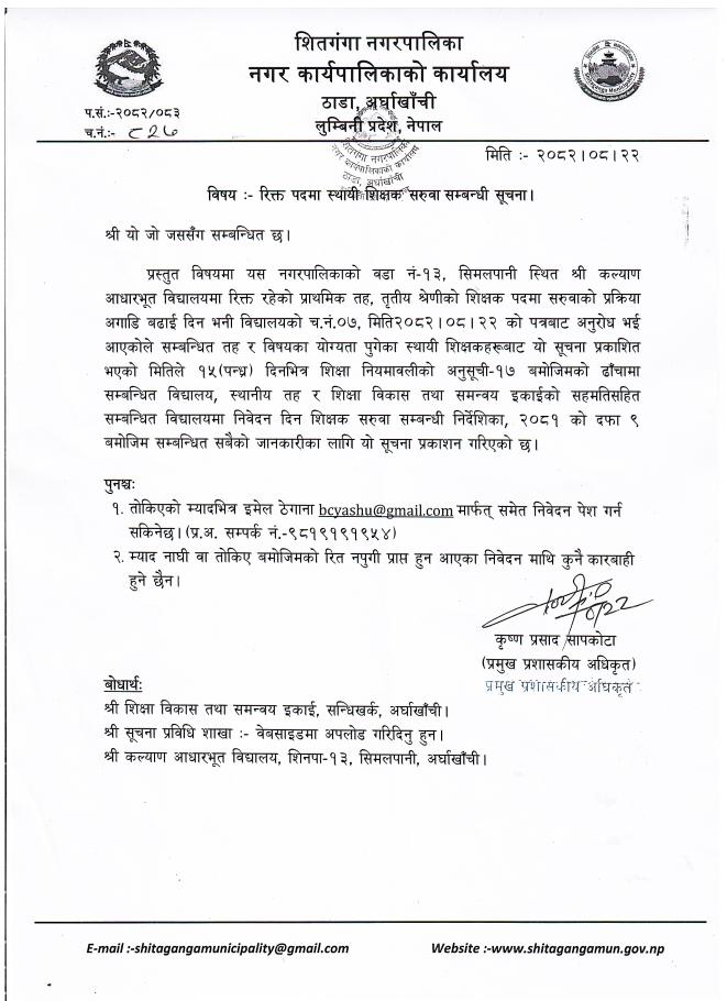 रिक्त पदमा स्थायी शिक्षक सरुवा सम्बन्धी सूचना - श्री कल्याण आ.वि, शि.न.पा. १३ ।
