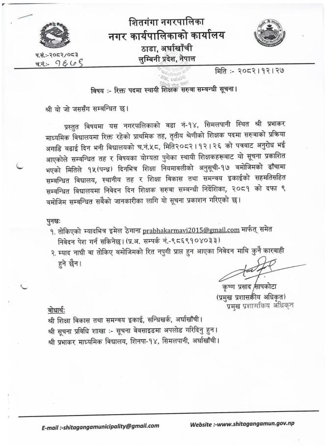 रिक्त पदमा स्थायी शिक्षक सरुवा सम्बन्धी सूचना - श्री प्रभाकर मा.वि., शि.न.पा. १४