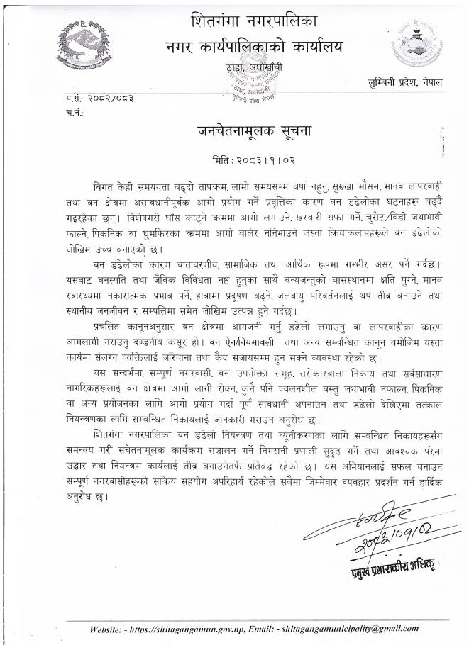 शितगंगा नगरपालिकाद्धारा जारी जनचेतनामूलक सूचना ।।।