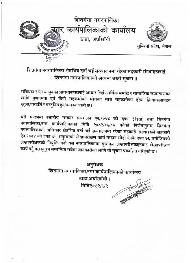 शितगंगा नगरपालिका क्षेत्रभित्र दर्ता भई सञ्चालनमा रहेका सहकारी संस्थाहरुलाई शितगंगा नगरपालिकाको अत्यन्त जरुरी सूचना ।।।