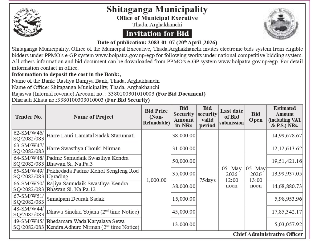 Invitation for Bid - Date of publication: 2082/12/22 on Gorkhapatra